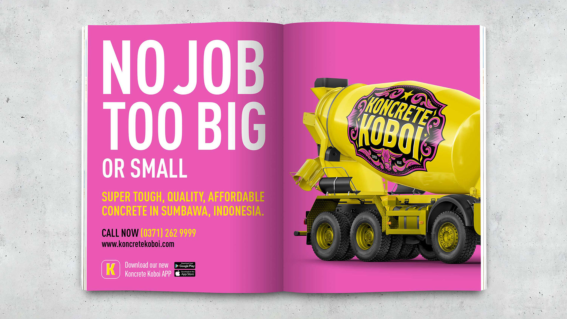 Koncrete Koboi (English: Concrete Cowboy) provides strong, affordable, quality concrete throughout Indonesia. Not your typical-looking concrete brand, Koncrete Koboi is all about standing out in an ordinarily dull industry. We set out to change the perception and expectations of what people think concrete brands should look like.