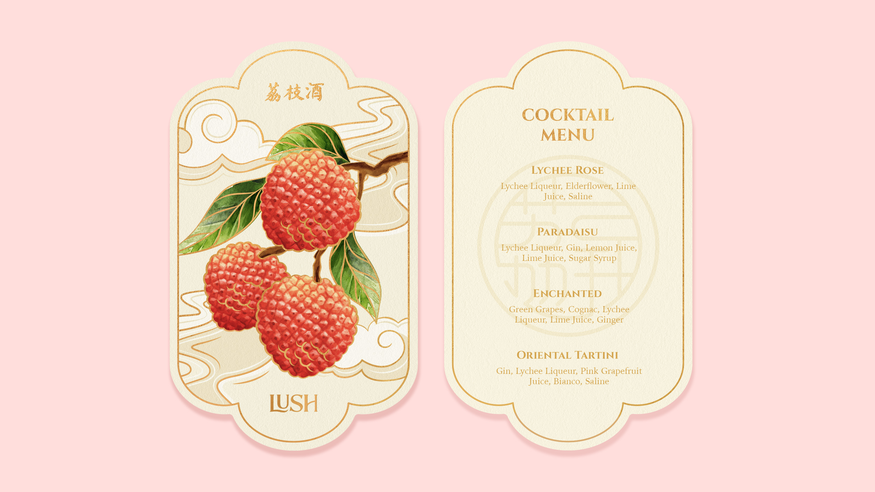 The design draws from Chinese imperial motifs and traditional fruit illustrations, reimagined with a contemporary edge. A warm palette and gilded accents capture the richness of lychee. From packaging to brand applications, Lush projects an inviting sense of wonder — premium yet playful, culturally rooted yet globally ready.